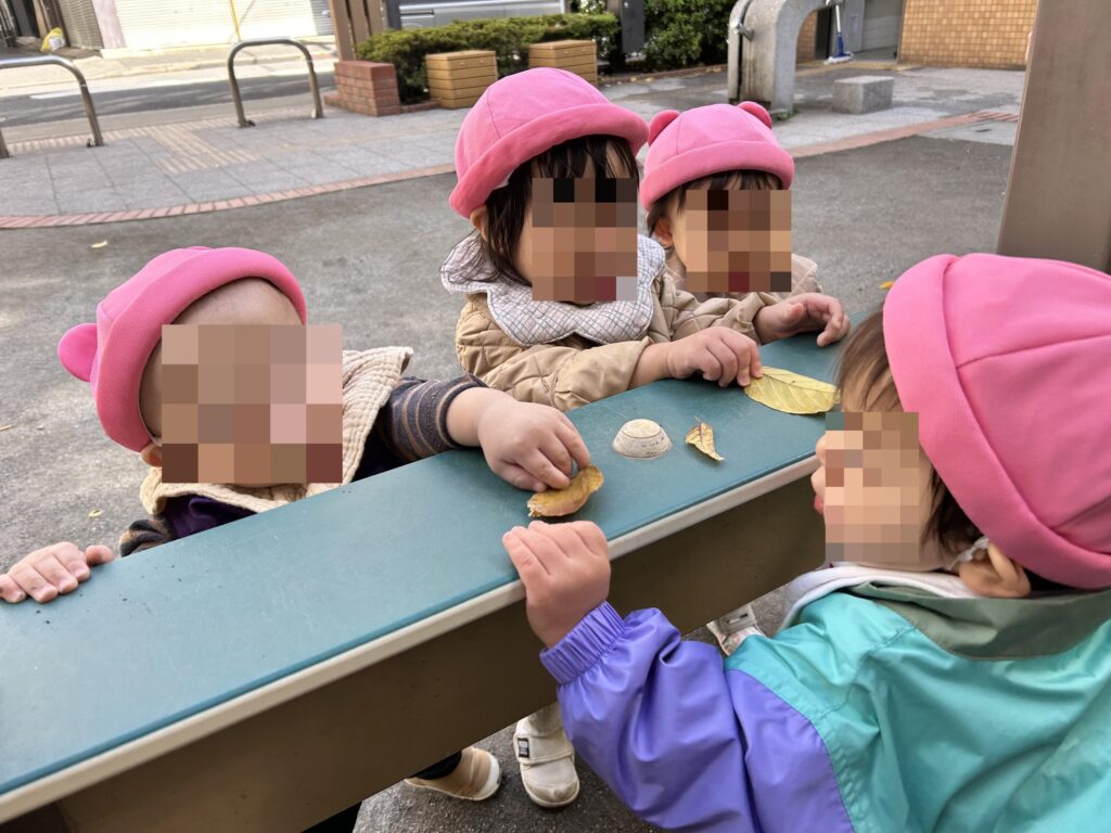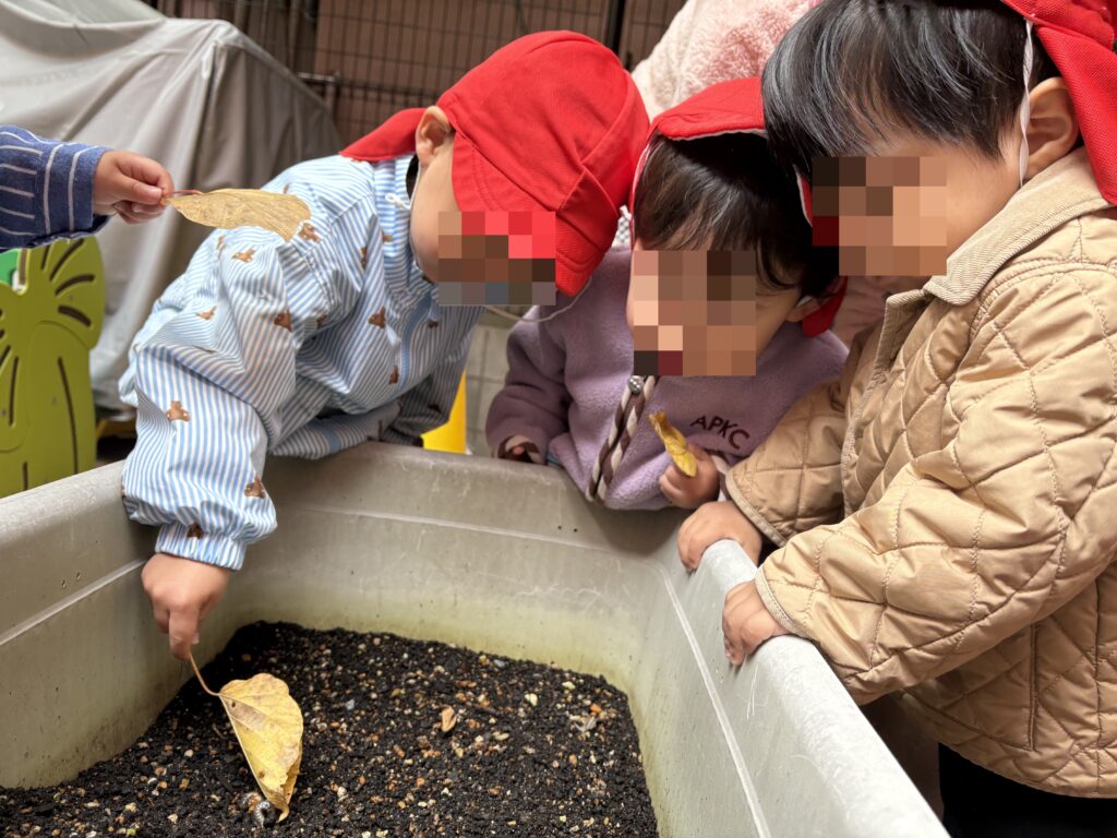 落ち葉で遊ぶのが好きで、遊具に上に並べて友だちと落ち葉を見せ合ったり、シャベルの代わりに落ち葉を使って土いじりをするなど、子どもたちなりに工夫しながら遊んでいます。