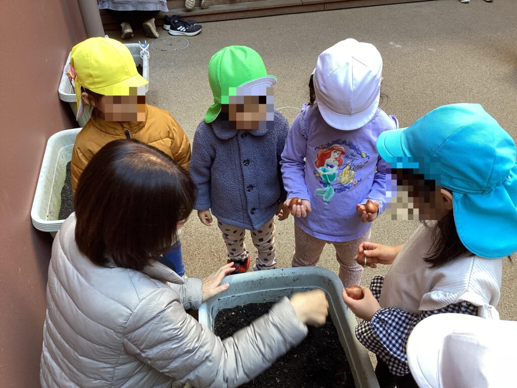 何色のチューリップが咲くか、ワクワクしている子どもたちです。